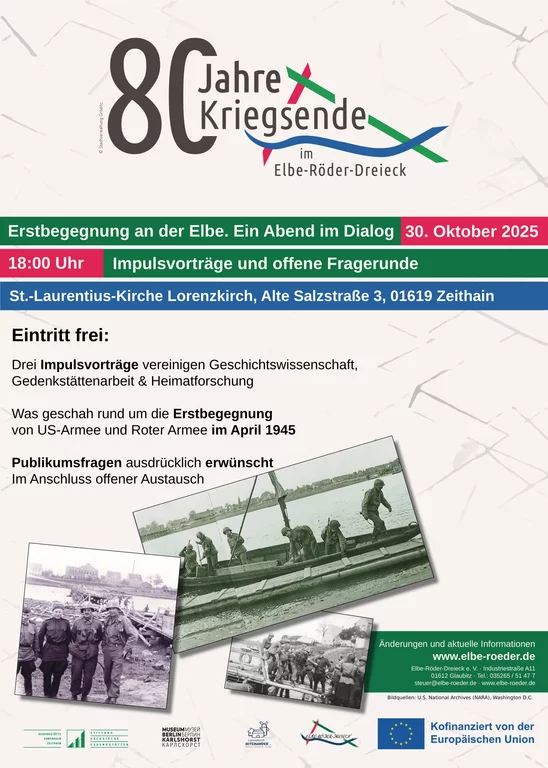 Am 30. Oktober 2025 fand in der Kirche Lorenzkirch die Veranstaltung „Erstbegegnung an der Elbe – Ein Abend im Dialog“ statt. Zwei Fachvorträge von Arkadi Miller (Museums Berlin-Karlshorst) und Jens Nagel (Leiter der Gedenkstätte Ehrenhain Zeithain) beleuchteten die Begleitumstände der Erstbegegnungen an der Elbe und die damit verbundene Gedenkkultur. Rund 70 Besucher und Besucherinnen verfolgten die spannenden Beiträge und beteiligten sich anschließend an einer lebhaften Diskussion über Erinnerung, Quellenarbeit und regionale Geschichte. Die Veranstaltung war Teil der Reihe 80 Jahre Kriegsende im Elbe-Röder-Dreieck sowie 30 Jahre LEADER im Elbe-Röder-Dreieck und unser Verein war dabei tatkräftiger Helfer.